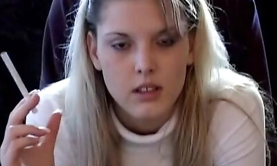 Slutty blond Sneganna smokes a cigarette and fucks herself