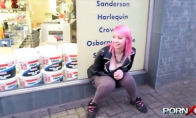 Kinky pink haired emo girlie in tight yoga pants pisses outdoors for dude